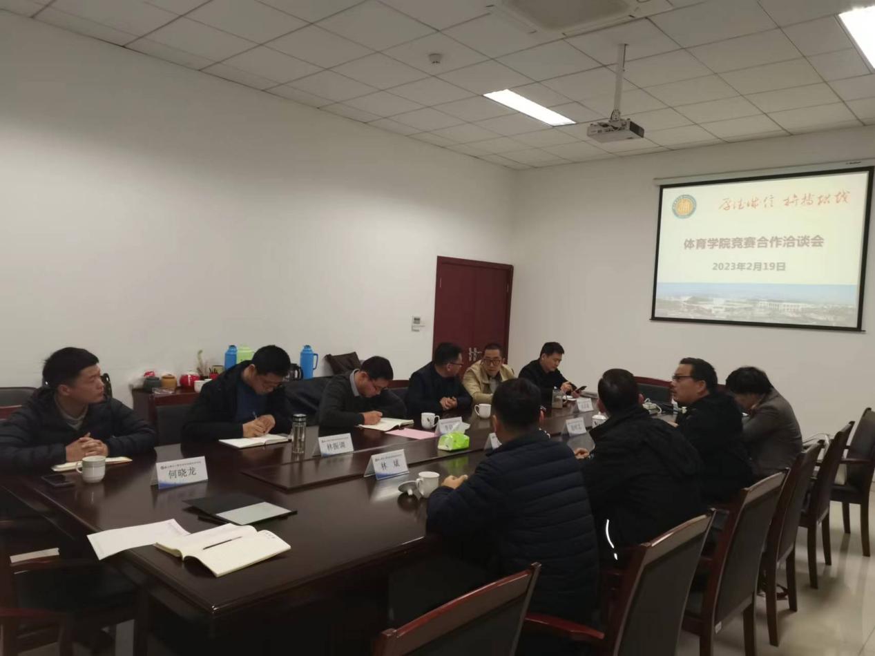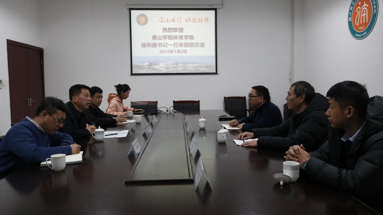 2023年3月2日,黄山学院体委副主任、校体委办公室主任、体育学院党总支书记杨和健一行4人来今年会交流,党委书记姜洪友,党委委员、公体部主任沈军,办公室主任王海红参加座谈会,会议由党委书记姜洪友主持。双方就党的建设、专业建设、课程思政、大学体育俱乐部改革、学生运动竞赛等议题进行了交流与探讨。