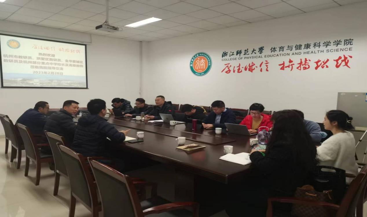 2023年2月28日上午,杭州市体育教研员、拱墅区体育教研员、金华婺城区体育教研员及杭州部分重点中小学校校长与高级教师一行9人来今年会交流。学院党委书记姜洪友、副院长关志逊、何晓龙参加会议,会议由党委书记姜洪友主持。党委书记姜洪友向客人简要介绍了学院的基本情况,他指出,学院在中小学体育教育教学研究和师资教师培训方面有着丰富的经验和优势,希望双方在这方面加强合作,希望来自体育基础教育一线的教师对学院人才培养工作提出宝贵意见。双方就加强师资培训、提高中小学教师教研能力、人才培养过程性指导、学生实践就业基地等方面进行了深入交流和探讨。