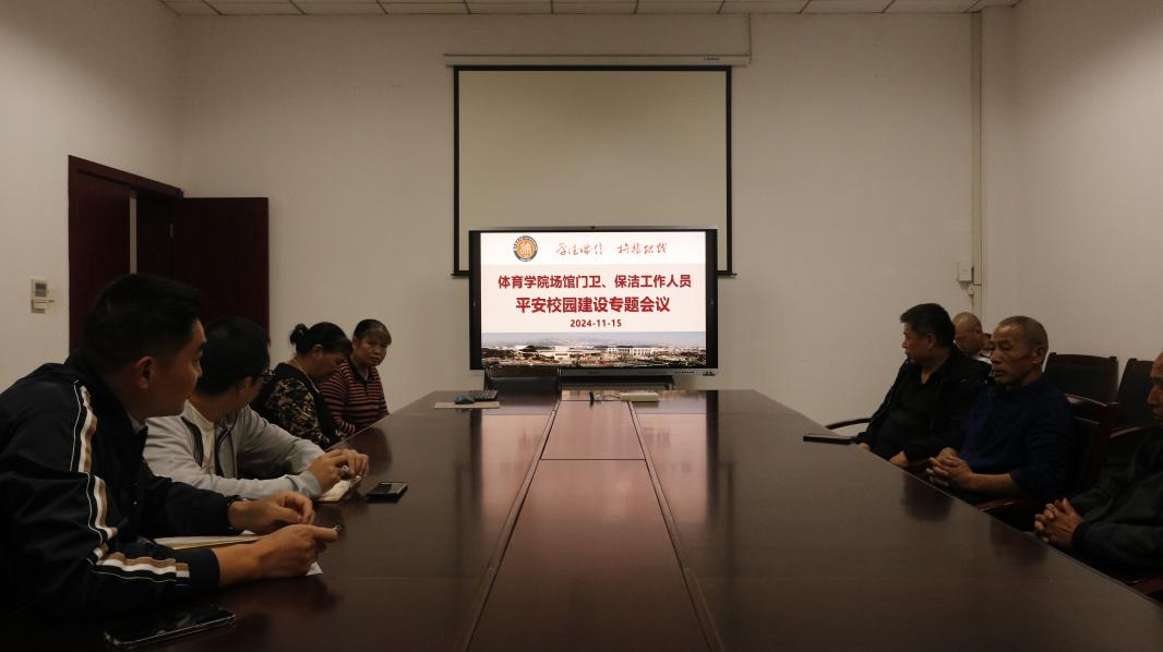 11月15日下午,学院召开体育场馆门卫、保洁工作人员平安校园建设专题会议。学院党委书记姜洪友、副院长关志逊、场馆管理中心主任张加光,体育场馆中心全体门卫、保洁工作人员参加会议。副院长关志逊主持会议。