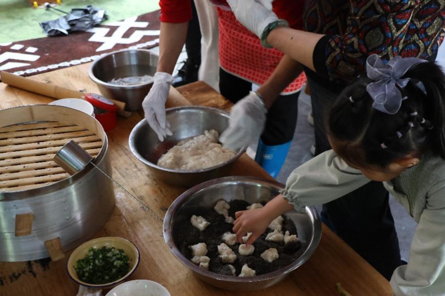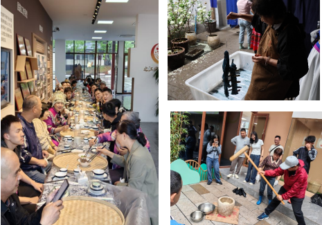 午餐以畲族长桌宴为特色,乌米饭、畲家腊肉、艾草糍粑等传统美食铺满长桌。教职工围坐共享,品味“以食会友”的待客之道,感受畲族人的质朴与热情。用餐结束后,大家跟随导游来到石坛。蒸熟的糯米倒入石臼,教职工们轮番挥杵,在“嘿哟”的号子声中合力捶打。糯香弥漫间,麻糍裹上芝麻糖粉,软糯香甜的劳动成果瞬间被一扫而空。