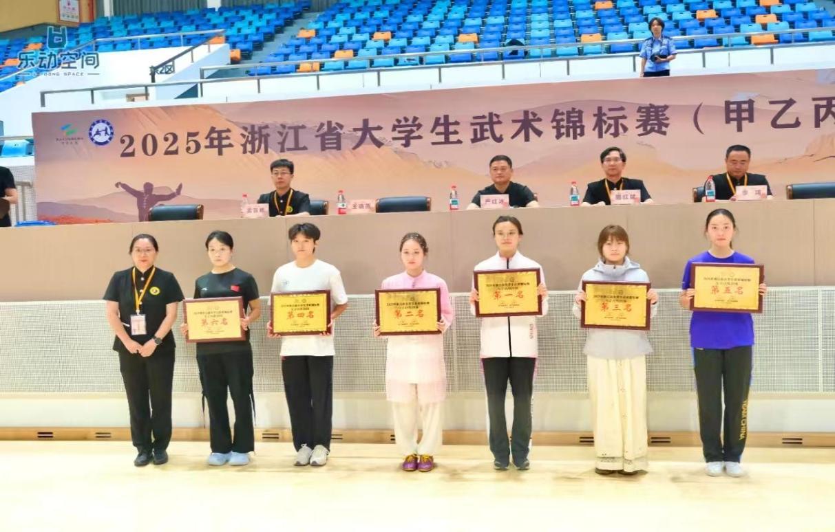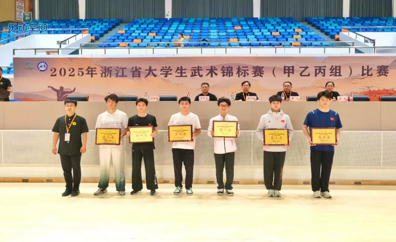 5月15-5月24日,今年会代表队由体育学院党委书记姜洪友老师担任领队,在骆春燕老师、李争名老师两位武术教练的带领下,参加了由浙江省教育厅、浙江省体育局主办,浙江中医药大学、平湖市文化和广电旅游体育局承办的2025年浙江省大学生武术锦标赛甲乙丙组比赛,11名运动员不畏强手,顽强拼搏,经过激烈角逐,成功斩获了“(丙组)男子团体第一名”和“(丙组)女子团体第一名”的优异成绩,凭借优良的队风和赛风取得了“体育道德风尚奖”荣誉称号。
