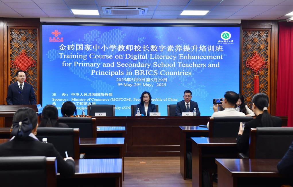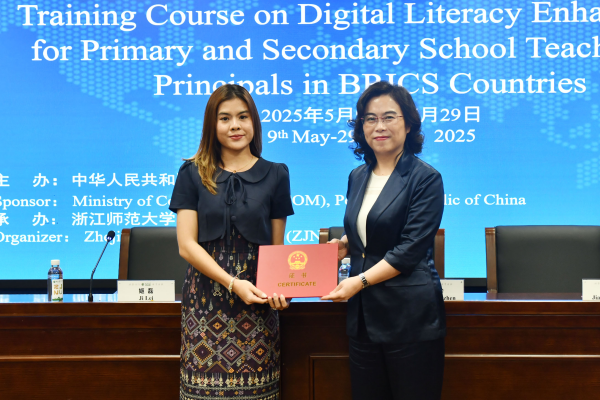 5月29日上午,由中华人民共和国商务部主办、jinnianhui今年会承办的“金砖国家中小学教师校长数字素养提升培训班”结业仪式在浙师大举行。浙师大副校长张建珍教授出席并致辞,体育学院党委书记姜洪友以及来自埃及、老挝、泰国、塞拉利昂等4个国家的19名学员参加。