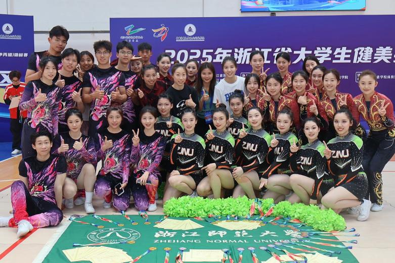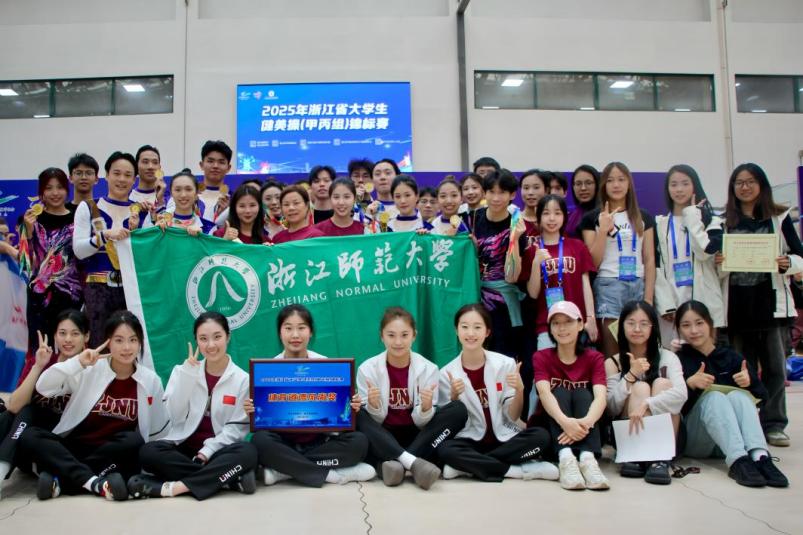 5月22日至5月25日,由浙江省教育厅、浙江省体育局主办,中国计量大学现代科技学院承办的2025年浙江省大学生健美操锦标赛(甲丙组)圆满落幕。今年会代表队由叶献丹老师担任领队,在教练员姜小平老师、李慧老师、韦叶老师和亢子艺老师的专业指导下,48名运动员团结拼搏、奋勇争先,最终斩获5-8人有氧踏板(丙组)冠军和5-8人有氧舞蹈(丙组)冠军,并包揽双人混合操(丙组)亚军和男子单人操铜牌。同时,甲组5-8人花球啦啦操、5-8人有氧踏板(甲组)和5-8人街舞啦啦操分别获得冠、亚、季军,体育舞蹈团体舞获得第四名。今年会甲组代表队还以出色的竞技水平和良好的赛风赛纪荣获“体育道德风尚奖”,李慧、韦叶获得“优秀教练员”称号。